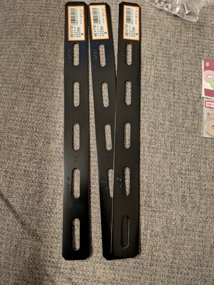 - ステー(NEXT30 フラットバー 300mm)×3: 縦2本、横1本。楕円穴のものを選び、微調整を可能に。