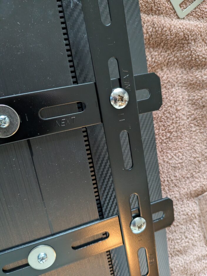 まずはモニター側のVESA穴(100x100mm)にステーを取り付けていきます。 縦に2本のバーを配置し、その2本を橋渡しするように横1本のステーを連結。これで強固な__「H型マウント」__が完成します。 ステー同士の連結にはM5のボルトとナットを使用。そして、ステーの大きな楕円穴からM4ネジが抜けないよう、__特寸ワッシャー(大径ワッシャー)__を導入しました。これで面圧を稼ぎ、指で押してもびくともしない「自分専用のフック」がモニターと一体化しました。