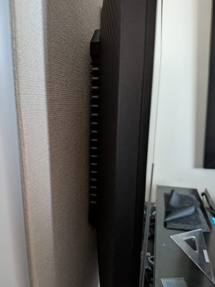 完成したモニターは、もはや壁の一部です。 壁との隙間は、ボルトの頭の厚み分のみ。市販のどんな薄型金具よりも壁に近い、文字通りのゼロ距離を実現しました。